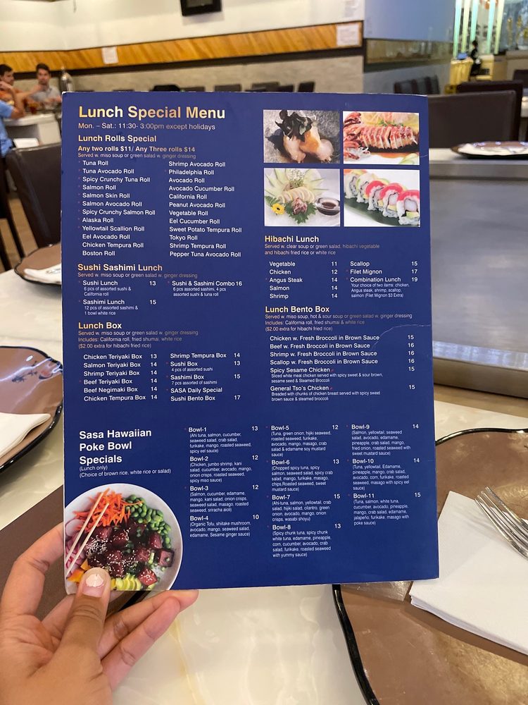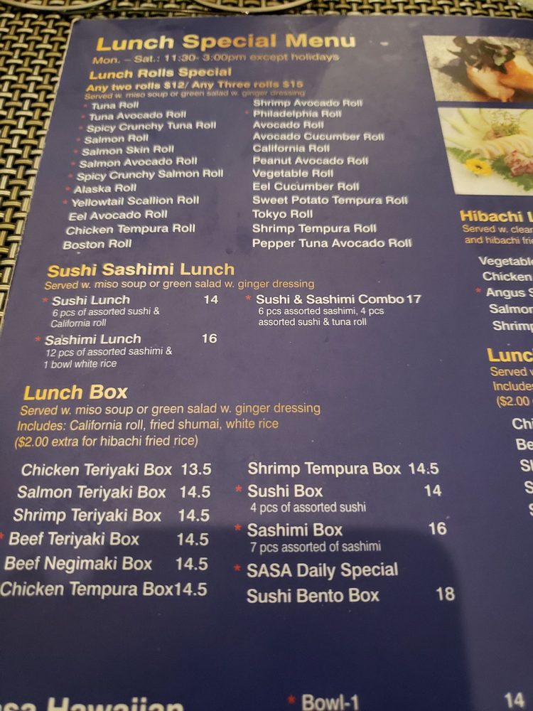 Sasa is a sushi bar located at 2119 Broad Hollow Rd Farmingdale, NY 11735, offering a variety of delicious and innovative dishes. The menu includes a range of salads such as the Avocado Salad with ginger dressing, the Beth Salad with chicken, shrimp, crab salad, and spicy miso sauce, and the IKA SALAD. For soup lovers, options like Clear Soup, Hot and Sour Soup, and Lemongrass Seafood Soup are available. Sasa also offers Poke Bowl Specials for lunch, featuring combinations like Ahi tuna, salmon, cucumber, seaweed salad, crab salad, mango, and spicy eel sauce. The restaurant has a casual, trendy, and classy ambiance, perfect for groups, kids, and both lunch and dinner outings. With wheelchair accessibility, free Wi-Fi, and a Full Bar, Sasa provides a comfortable dining experience with a touch of sophistication.